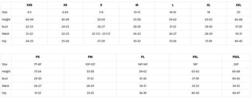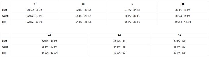 All measurements below are taken in inches. Variations in sizing may occur. Some items may not confirm to this chart.